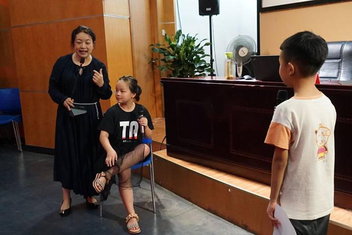 蕭萍邀請學生上臺互動扮演媽媽和沐陽