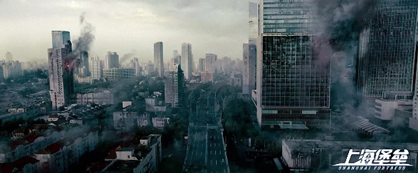 就這個角度來看,《上海堡壘》可以說是一下子走出去一大步。一直以來,出于各種規則或者潛規則,國產電影都盡量回避具體的城市名字?!渡虾1尽愤@一次非但做到了城市名稱完全實化,而且把上海的地標建筑毀了個十足過癮。甭管是外灘這一邊的萬國建筑群,還是靜安寺啥的,都煙火紛飛千瘡百孔。在電影里呈現出這樣一種熟悉畫面的陌生模樣,有一種更強烈、更直接、更刺激的美感。尤其是東方明珠塔附近的江面上出現一個大坑,湯臣一品的房子一棟接一棟塌進去,這畫面比過去欣賞好萊塢電影里的任何一處建筑被毀,都更能撩人心弦。