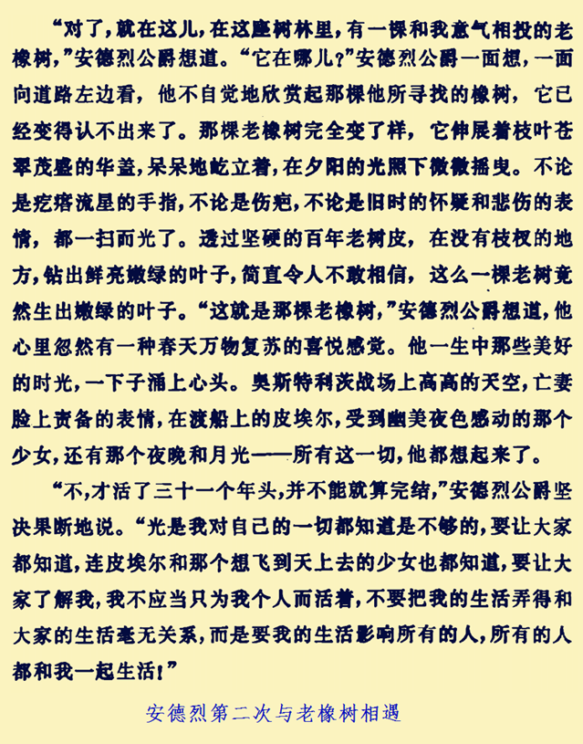 托爾斯泰善于通過描寫心理變化的過程展示人物思想性格的演變,俄羅斯文藝理論家車爾尼雪夫斯基將這種藝術特色命名為“心靈辯證法”?!稇馉幣c和平》中的著名片段“安德烈與老橡樹的兩次相遇”即運用心靈辯證法的方式寫出了安德烈的內心轉變。