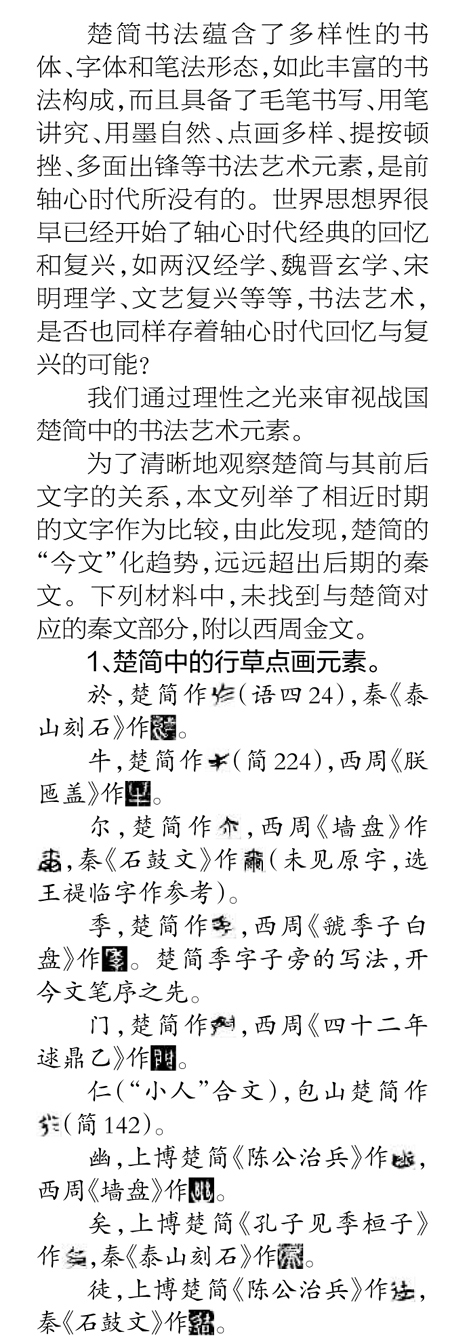 戰國楚簡,是當前出土最多的軸心時代經典文獻,其簡書墨跡中顯現了隸變的發端。從楚簡文字的“今文”化、多元性書法元素來看,楚簡“經典書變”的方向并非限于“隸定”,下面以楚簡為例論述。