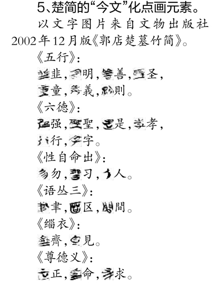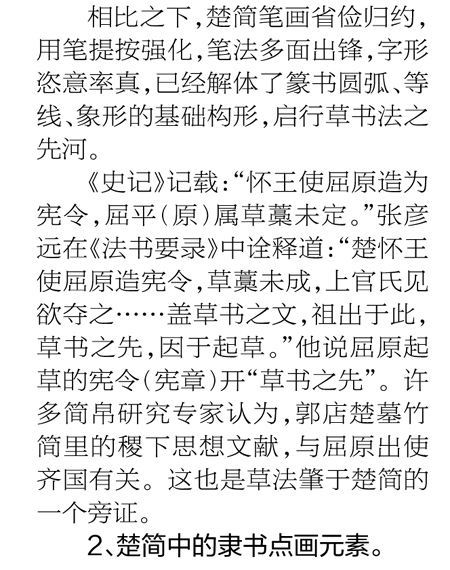 關于楚簡文字,郭沫若先生認為:“體式簡略,形態扁平,接近于后代的隸書?!濒缅a圭先生也認為:“如果秦沒有統一全國,六國文字的俗體遲早也會演變成類似隸書的新字體的?!别堊陬U先生也有相同的觀點。思想經典的抄寫,啟迪了書寫者的自由意志和人性發微,產生了多樣的筆法、墨法、章法形態,具備了后來草、隸、行、楷多種字體的筆法和結構。