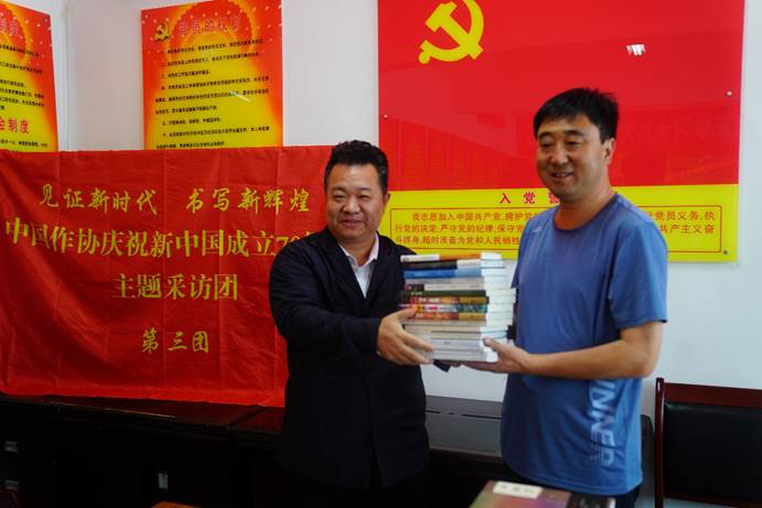 座談會結束后,邱華棟向池溝村捐贈采訪團成員創作和簽名的作品。同時,采訪團作家在采訪團旗幟上鄭重簽名留念。