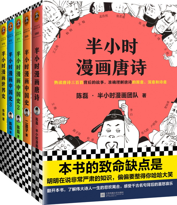 相比學校里填鴨式的唐詩教學,陳磊更希望大家用更形象的方式去認識唐詩。在《半小時漫畫唐詩》中,原本活在教科書上的詩人們有了更鮮活的形象,初唐四杰分別為王勃、楊炯、盧照鄰和駱賓王,書中戲稱他們為“初唐F4”。又例如講賀知章,37歲之前的人生用“學霸”兩個字點評,37歲高中狀元,從此人生開掛,運氣好到爆炸。陳子昂、張若虛兩位大神去世以后,他妥妥地C位出道,成了盛唐詩壇的老大哥。