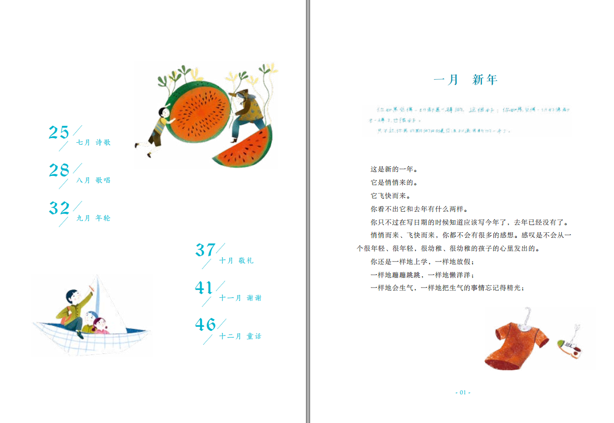 十二個月的時光悄然流逝,訴說著中國孩子在一年生活中的點點滴滴:春節到來,孩子們張燈結彩,迎接新年;清明節,孩子們祭奠英雄,寄托哀思;暑假,孩子們揮灑汗水,享受青春;新學期到了,孩子們下定決心要有一個新的開始;冬雪降落,孩子們感謝親朋給予的一年的溫暖……作者梅子涵以詩一般的語言,選取了從年初到年末的十二個最具特色的生活片段,結構完整,形式活潑,文辭優美。孩子在一年的成長中,懂得了愛勞動、愛祖國、感恩師長、努力學習,也感受到了希望、幸福等積極情感。同時本書邀請了意大利知名插畫家莎拉繪制封面及插圖,優美的文字輔以精美的插圖,能夠培養兒童在文學和美學方面的能力。