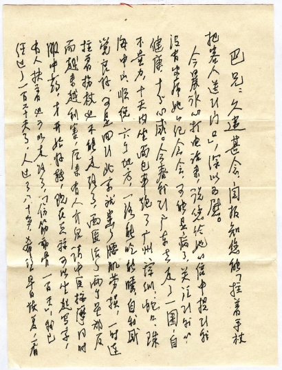 “巴老:光年同志回京后,在周揚同志家里相見,聽他詳細談到您的情況,得知您健康恢復較好,并愿繼續擔任作協領導工作,心情也較好,十分欣慰!