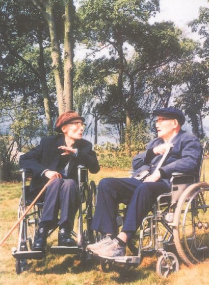 同年金秋,祖父應浙江省政府邀請再次回到杭州,并在家鄉度過了他92歲的生日。期間,巴老也在杭州休養。兩位老人兩次聚首。10月8日,巴金來到西子賓館回訪的時候,留下了一張最后的合影。坐在輪椅上的他倆,戴著遮陽帽,在綠樹叢中,隨意地閑聊著,跟平常公園里的普通老人沒有區別。