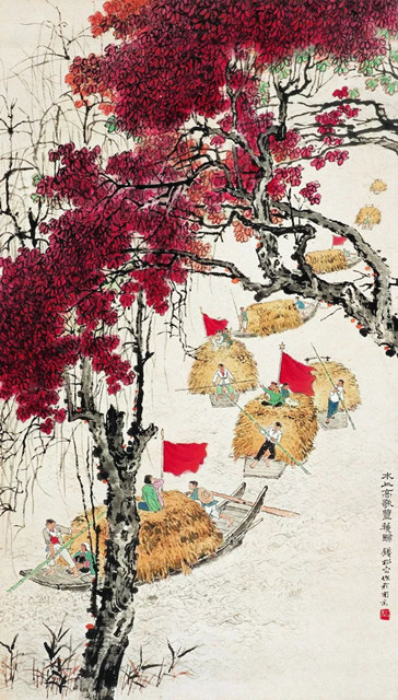 江南自古就是魚米之鄉,河汊縱橫,水網密布,風調雨順,人杰地靈。1949年之后,錢松喦立足于他的家鄉和周邊的江南生活,創作了一系列農業題材的作品,其中有《秋耕突擊隊》《排澇》《軍民浚湖積肥》《運料》《罱河泥》等,而《水上高歌豐獲歸》則是這一時期表現豐收的代表作?!端细吒柝S獲歸》有著不同一般的構圖,在秋天紅葉樹籠罩下的河上,滿載著豐收成果的船正航行其間,船上的人有的劃槳,有的撐船,有的坐在稻堆上。而每一船上的稻堆上都插著紅旗,表現出了那個時代中的特點。因此,畫面中的景象也就成為那個時代中豐收圖景。錢松喦用嫻熟的技法,用文人的筆墨,在表現樹木方面顯現出了他深厚的功底。這里紅葉所表現的幾乎就是一幅江南的秋景,河邊的蘆葦以及水草的點綴,更把這個特殊地理環境中的景象做了基本的交代,而這些配景所構成的江南特質,也表現出了錢松喦藝術語言的特點。盡管河內這一滿載收獲的船隊只有那紅旗具有那種時代的裝飾特征,然而它們非常自然的交錯在一起,讓人們感覺到了爭先恐后。這種具有江南水鄉特色的內河中的小船雖然不是很大,但是,在數量上的彼此關系,以及滿滿的裝載,正是江南農村生活的寫照,而源源不斷也成為這幅畫的一個特點。從近景到遠處一共有可數的8條船,而畫外的存在則在預想之中。這8條船的表現以及它在畫面上的角度完全不同,因為它們在行駛的過程中的這種不規則,正表現了規則中的運動的基本態勢,也表現了錢松巖在構圖方面的獨特處理。為了尋求這種變化,為了表現變化中的生活,這幅畫在整體的主題表現上顯現出了多樣性的變化。錢松喦在這幅作品中用一種貌似比較散的構圖,而集中表現了秋天中江南常見的內河景觀,它讓人們看到的這樣一種景象,正是人們可以感受到的江南的秋天這樣一個豐收的季節。