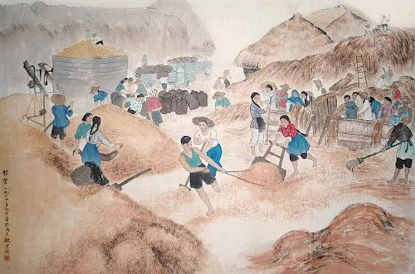 在新中國美術的創作中,從王盛烈的《農業生產合作社小麥豐收》、陳光健《歌豐收》,到錢松喦《水上高歌豐獲歸》、魏紫熙的《收獲歸來》,再到賀天健的《大有年》、關良的《豐收圖》、伍螽甫《秋收風景》,美術家們一代代以畫作表現著所熟悉的農村以及農業和農民,這些畫作有真實再現,也不乏映照著一段時期的浮夸之風,然而卻都是時代的印記,不僅構成了新中國農業發展的歷史,也記錄從1949年以來農民希望走向小康的真實的夢想與歷史。