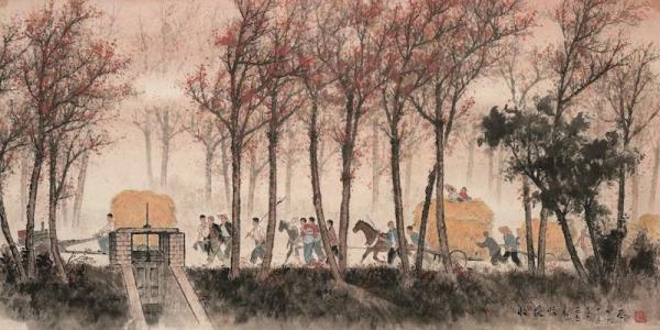 進入70年代,魏紫熙表現豐收主題的作品離開了他慣常的曬場,1971年創作的《收獲歸來》則把收獲歸來的空間放到了河堤之上,呈現了一個不一樣的“遍地英雄下夕煙”的情景。該畫完全沒有那個時代中的特點,沒有紅旗和標語,也沒有那個時代中常見的許多符號,可是,表現人民公社的秋收卻是非常平實的鄉村中的一種特別的自然景象。畫面前方的左邊有一個水閘,表明了它是在河堤這樣一個特殊的環境之中。河堤邊上秋天的紅葉樹林營造了整體的秋天氛圍。在這平直的河堤上,前面是拖拉機,后面是馬車,都是滿載的收獲。知識青年不管是開拖拉機,還是幫著拉板車,他們在收獲歸來的路上滿載著喜悅的心情。這里以“歸”為契機,離開了田地,離開了收割,也離開了汗水,而是在歸程的路上,因此,歸來的心情與正在勞動的狀態完全不同。知識青年在農村這一“廣闊天地”之中,在鍛煉中成長,大有作為,正如同收獲的今天一樣,是一種不同于往日的特別的心情。毫無疑問,這是一個特殊年代中的景觀,但是,魏紫熙在處理“豐收”題材,在處理人物關系以及知識青年和農民之間的關系等,都成為這個時代中的一件非常重要的作品。