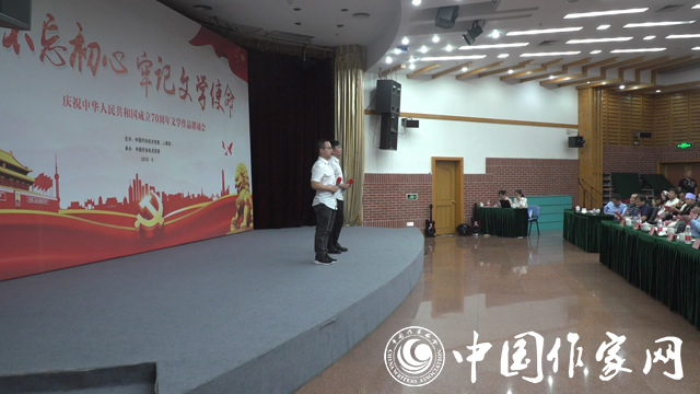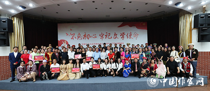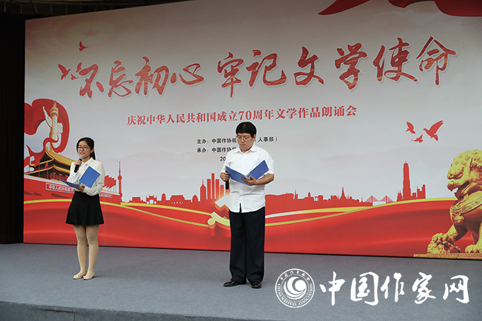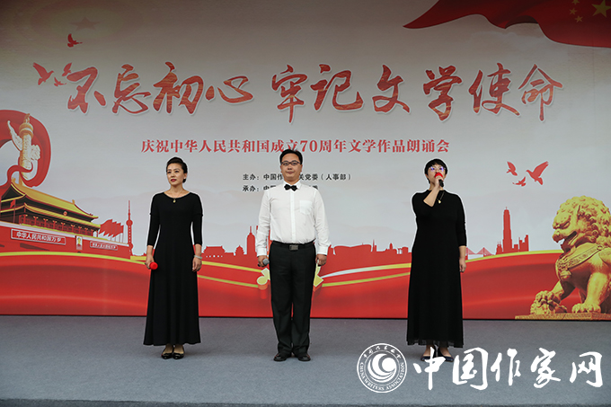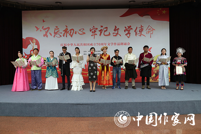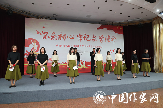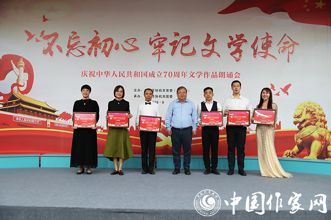 為進一步重溫近代以來中國人民和中華民族不懈奮斗的偉大歷程,回顧新中國成立70年來取得的偉大成就,引領和激勵中國作協干部職工堅持以習近平新時代中國特色社會主義思想為指導、為實現中華民族偉大復興的中國夢不懈奮斗,9月24日,由中國作協機關黨委(人事部)主辦、中國作協機關團委承辦的“不忘初心牢記文學使命”慶祝中華人民共和國成立70周年文學作品朗誦會在中國現代文學館舉行。中國作協主席鐵凝,中國作協黨組書記、副主席錢小芊,中國作協副主席、機關黨委書記吉狄馬加,中國作協副主席閻晶明,中國作協書記處書記魯敏出席觀看,分別為獲獎節目頒獎,并與全體演職人員合影留念。