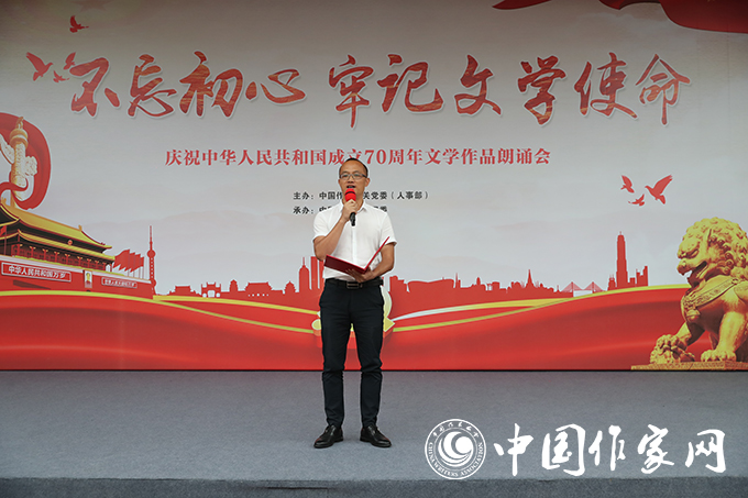 吉狄馬加在致辭中說,70年前,毛澤東同志向全世界莊嚴宣告中華人民共和國成立。70年櫛風沐雨,波瀾壯闊;70年砥礪奮進,滄海巨變。今年同樣是中國作協成立70周年。習近平總書記專門發來賀信勉勵我們,自覺承擔起舉旗幟、聚民心、育新人、興文化、展形象的使命任務,為繁榮發展社會主義文藝事業、建設社會主義文化強國,為實現“兩個一百年”奮斗目標、實現中華民族偉大復興中國夢作出新的更大的貢獻。我們走得再遠,都不能忘記來時的路。今天,我們隆重舉行此次文學作品朗誦會,慶祝新中國70周年華誕。讓我們共同祝愿偉大祖國的明天更加光輝燦爛,祝愿中國作協各項工作蒸蒸日上,祝愿社會主義文學事業更加發展繁榮。