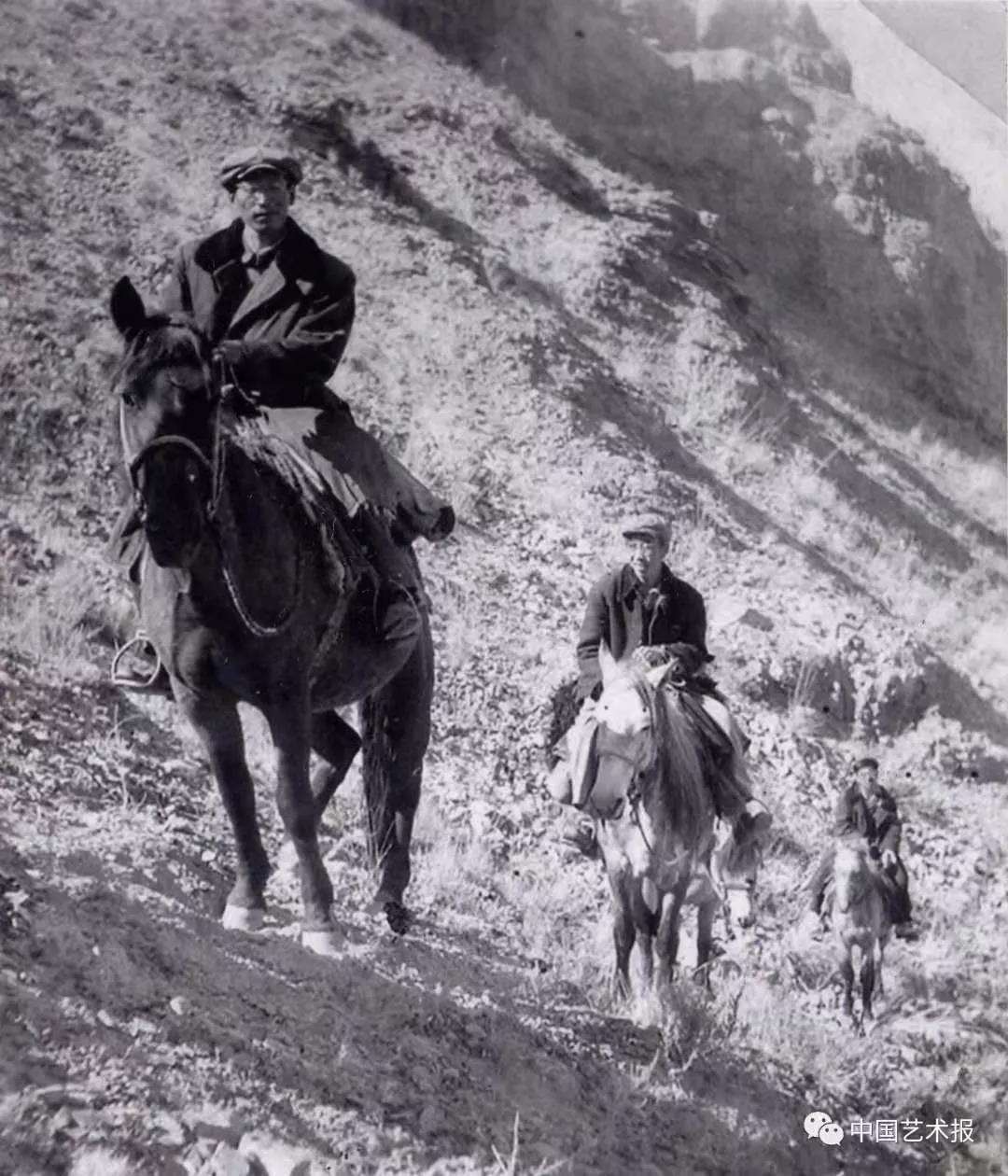 1964年,《瑪納斯》調查采錄組成員陶陽(左)、劉發?。ㄖ校?、趙潛德(右)在騎馬前往新疆阿合奇縣的路上