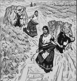 版畫家李煥民于1959年創作的套色木刻版畫《初踏黃金路》,反映了西藏和平解放以后廢除農奴制,藏族群眾翻身做主的新生活。在畫中,3位藏族女子各自牽著一頭牦牛走在金黃色的莊稼路上。這幅作品用高明度高亮度的紅、黃為主基調來烘托畫面喜慶豐收的氣氛,顯得璀璨奪目。作者采用肯定、簡練的刀法,并注重刀法的寫意性表現,與畫面中歡快的人物形象形成呼應,使作品在視覺上呈現出和諧的節奏感和韻律感。這幅作品既具有強烈的時代特色,又具有極高的審美價值。