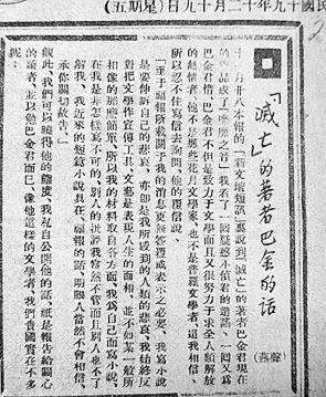 《福報》發表署名“聲燕”的短文《〈滅亡〉的著者巴金的話》