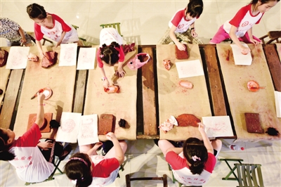 安徽合肥蜀山區半島新村社區的小朋友在體驗拓印技藝,感受傳統文化的魅力。葛宜年攝/光明圖片