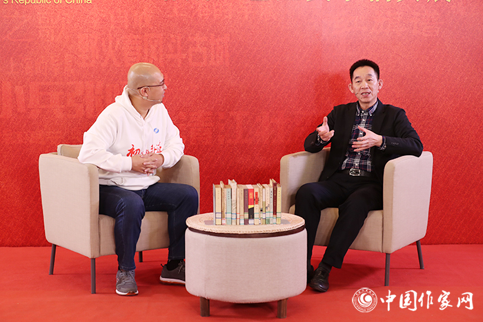 施戰軍(右)介紹《保衛延安》的創作過程以及陜西文學的源流發展