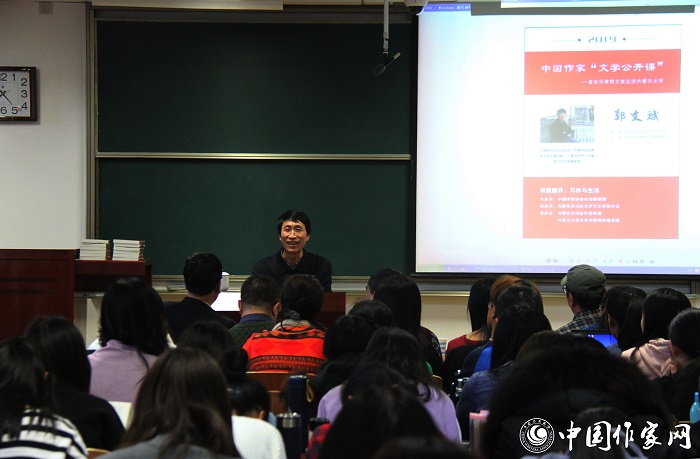 當日下午,郭文斌在內蒙古大學作題為“寫作與生活”的講座。他結合自己的具體創作經歷談到,生活是創作的源泉,要從熟悉的生活里尋找創作資源和素材。1998年是郭文斌創作道路上的一條分水嶺,從癡迷并探索現代小說、先鋒小說的“并不順利”,到回歸“故鄉寫作”的傳統文化領域后找到“敘述的節奏感、愉悅感、狂歡感”,進而開始有意識地寫作“農歷”系列。郭文斌坦言:“熟悉的鄉土、山川、河流激活了我的童年記憶和寫作潛能”。他還結合自己的作品《農歷》《尋找安詳》《醒來》等,從哲學、社會學、心理學等層面解讀“鄉愁”“農歷”“安詳”等意象的現實意義,認為文學作品對于人的心靈具有干預、塑造、滋養的功能,作家的創作不能停留在物質、感官等層面,而是要進一步深入人的情感世界、道德世界,深刻感知、挖掘人的主體性。