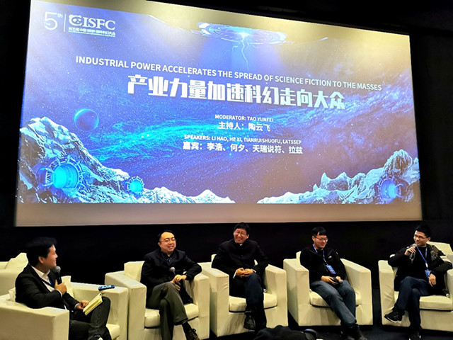 產業力量推動科幻文學走向大眾”分論壇現場 (左至右:閱文集團出版內容部總監 陶云飛、知名科幻作家 何夕、科幻世界雜志社副總編輯 拉茲、閱文集團科幻頻道資深編輯 李浩、閱文集團旗下作家 天瑞說符)