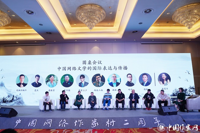 開幕式后,網絡作家唐家三少、管平潮、發飆的蝸牛、蔣勝男、南派三叔、酒徒,學者夏烈和咪咕數媒總編輯聽雨、橙瓜網首席執行官饒耿等以“中國網絡文學的國際表達與傳播”為議題展開討論。