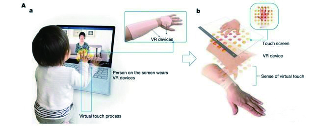 小女孩觸摸屏幕,佩戴觸覺傳感器的奶奶便感受到了小孫女的撫摸