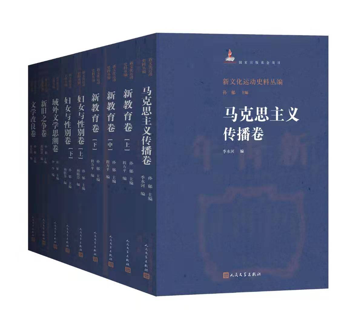 匆匆百年已過,舊時的報刊早已變黃發脆,學界和大眾一直缺乏兼具專業性、系統性和突破性的新文化運動史料集,關于新文化運動的史料亟需鉤沉和梳理。近年來,人民文學出版社組織來自北京大學、中國人民大學、北京師范大學、中國社會科學院文學研究所等國內眾多知名院校的專家學者齊聚一堂,精選、精編、精印了《新文化運動史料叢編》,并獲得國家出版基金項目資助?!缎挛幕\動史料叢編》由中國人民大學教授孫郁主編,季水河、范國富、李今、程方平、楊聯芬、徐紀陽等學者分卷編選,每卷收入新文化運動時期的原始史料,內容分為《馬克思主義傳播卷》、《新教育卷》(上、中、下)、《婦女與性別卷》(上、下)、《域外文學思潮卷》、《新舊之爭卷》、《文學改良卷》,計六卷九冊,四百余萬字,時間跨度上溯民國初年,下至1923年前后。