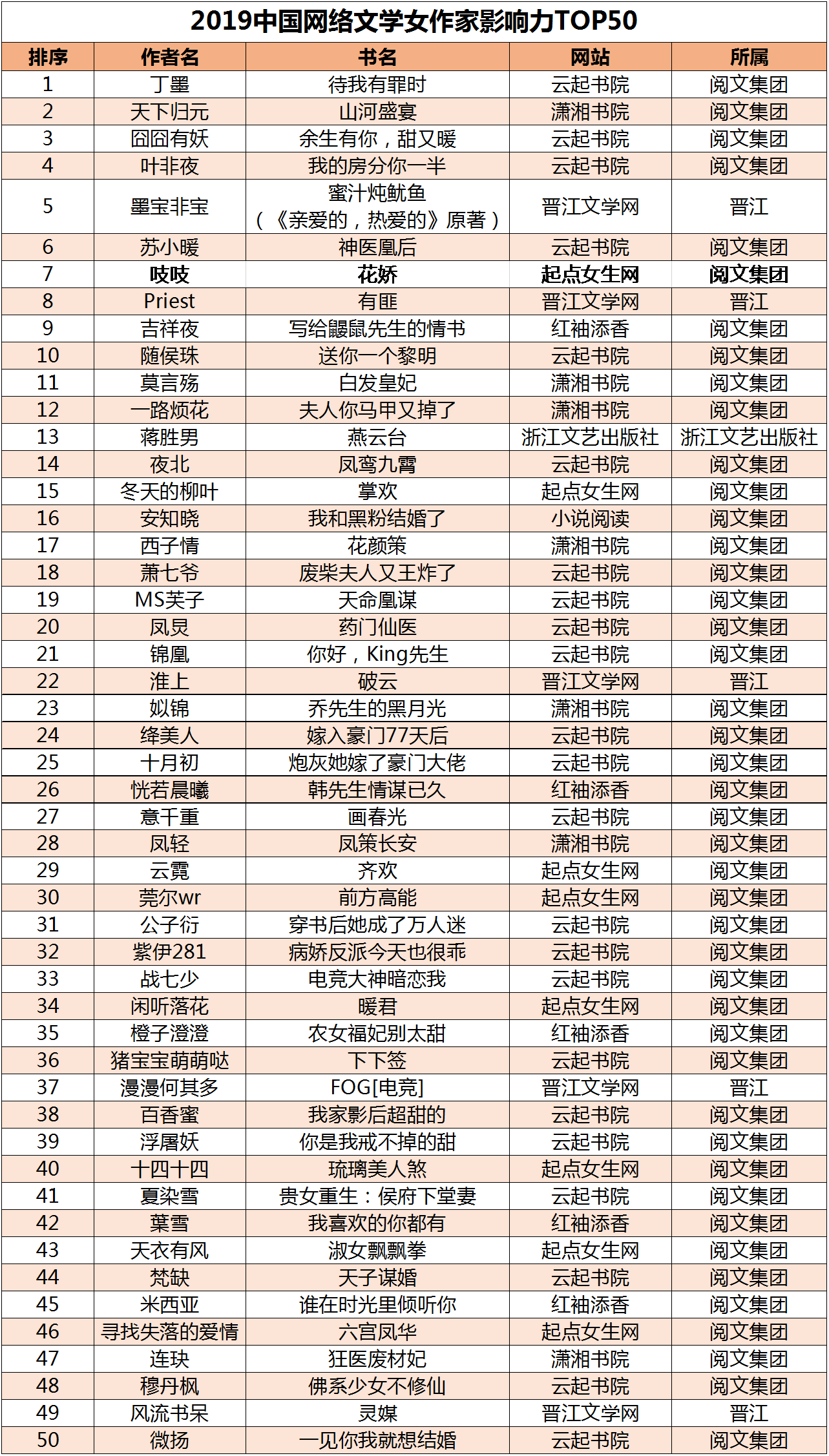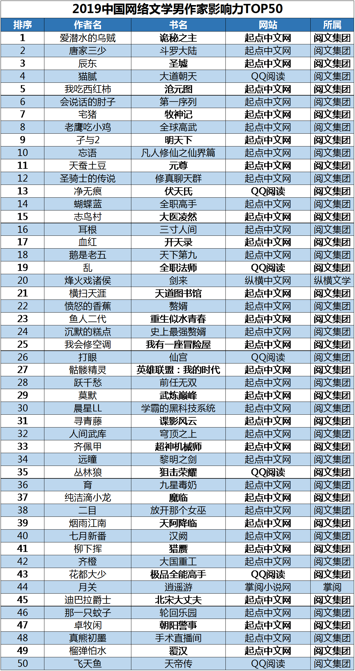 2019年中國網絡作家影響力榜男作家TOP50及女作家TOP50