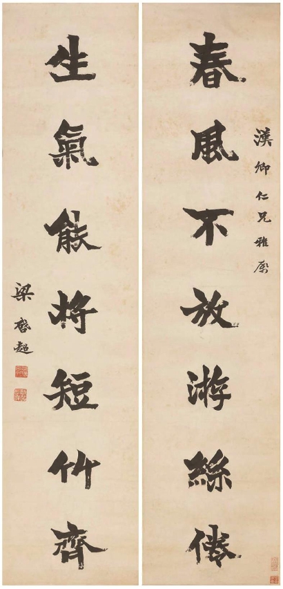 再如此冊所收林長民的書法作品。過去學界及書法界對于林氏的書法討論不多,近年坊間疊見氏之法書,多屬大字,下筆灑落,品格不俗。此幅是他贈給金鞏北(民國北京畫壇盟主)的行書八言聯,極是精工。下筆凝重,純以中鋒行筆,如火箸畫灰,剛健質樸。在結字上,緊湊飽滿,不容懈怠。墨色變化則一任自然,凝重中時露飛白,更顯蒼勁?!笆弊制伯嬓辈?,“續”字左右錯落,“斯”、“長”略顯奇側,這些變化使整幅聯語平添些許趣味。王僧虔《筆意贊》:“書之妙道,神采為上,形質次之,兼之者方可紹于古人?!贝思蚪o人如是感覺。林長民殉難,徐志摩曾對林徽因說:“徐佛蘇挽聯,有‘沖鋒陷陣哪用書生’之句,說得真是。像林先生這樣的才學聲望,在天津賣字也過得下去,偏給郭松齡看上了,把他請去,叫太太陪了同車,一直開到前方去送命,前后半個月,活生生的一個人剩了一堆白骨,你說可怕不可怕!可惜不可惜!”高拜石《古春風樓瑣記·林長民塞上驚魂》:“提到宗孟的字,也值得一說。宗孟的書法,是由晉唐人入手的,早年寫的東西,真是美妙絕倫,中歲參了北碑的態勢,更在雅秀之中,顯出樸茂勁遒的意味;所謂‘融碑入帖’,便是這個境界??的虾W鳌稄V藝舟雙楫》,以評書家自命,曾和伊峻齋(立勛)說:‘你們福建書家,卻只有兩位……’伊峻齋以為他自己一定占了一個,那康圣人從容說:‘一個是鄭蘇庵(按即鄭孝胥),一個是林宗孟……’民國以后沈寐叟(子培)的字,風靡一時,有人把林寫的圣約翰大學校長卜舫濟的壽序來比,稱做‘書家兩雄’,因為沈培老的槎椏,算‘丑中之美’,林宗孟的字則為‘勁中之美’,確是一個天才書家,而他自己也風流自賞?!笨梢姰敃r人即有之評。