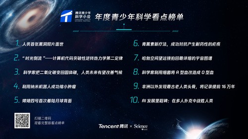 會上,騰訊與Science連續第二年共同推出《青少年科學看點榜單》,今年投票參與的青少年人數從去年的10萬猛增至120萬。投票結果顯示,包括黑洞、月球探測等在內的天文學話題最受中國青少年關注。