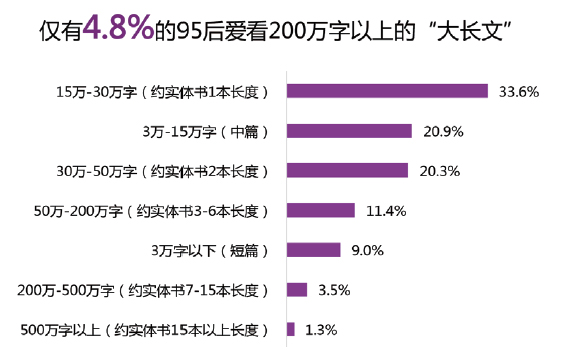 其次,輕量化的“小長文”漸成網絡文學主流。相比于紙質文學,網絡文學的一個突出特點便是“長”,曾幾何時,路遙長篇小說《平凡的世界》百萬字的篇幅已令很多 讀者望而生畏,然而如果將其放到網絡文學 領域,100 萬字或許只能算是“短篇”。其實,網絡文學的早期形態并不長,例如被譽為網文開山之作的《第一次親密接觸》(痞子蔡),其總長也不過 50 余萬??梢?,網文字數的長并不是“先天”的,從某種意義上說,它在很大程度上是由于資本的介入與網絡作家分成方式而導致的“注水”。那么,網文會持續“長”下去嗎?答案可能是否定 的,據統計(見圖 3),實際上僅有不足 5% 的Z世代人群愛看200萬字以上的“大長文”, 而相比之下,15—30 萬字的“小長文”成 為了“95 后”的最愛。顯然,“小長文”因 體量上的“輕”而更加適應年輕人細碎、零散的閱讀時間,當小長文迎合了 Z 世代的閱讀偏好,大長文一家獨大的地位便會漸漸喪失,輕量化的網絡文學成為主流之日便已然不遠。