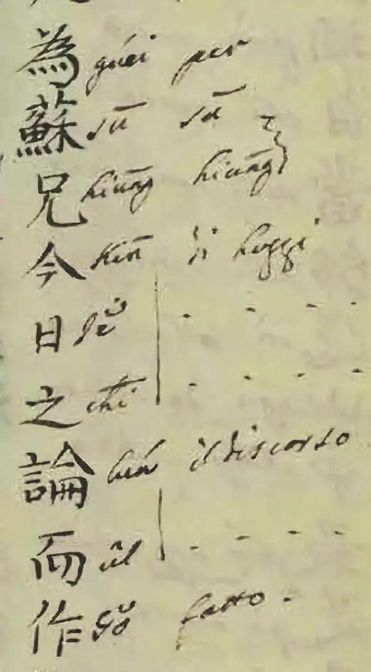 作者幫助讀者識字的意圖十分明顯。試舉幾例:中文“太?!薄案笔埂钡裙俾?,作者在注音后均譯為“官員”(mandarino)?!凹卓铺U洹北蛔g為“官銜”(nome di mandarinano)?!叭思摇弊g作“人”(huomino)和“家”(case)。為幫助不通意大利文的讀者有真切的感受,請允許我把這兩個意大利文名詞轉譯英文,前者是human,后者是house。human加house是漢語“人家”的意思嗎?還有更可樂的,“尚未聯姻”中的“尚未”被譯作“上面”(supra)和“不”(non)。常老師說:“萬濟國的語言能力令人嘆服,他不但能夠熟練使用漢語,而且還用西班牙語編寫了漢語教材《華語官話語法》”,這樣一位能人絕不可能不懂“人家”和“尚未”這兩個詞的含義,之所以逐字注解,他的用意顯然是幫助讀者識字,而不是請他們讀小說。最后再舉一個堪稱較好的完整句子“為蘇兄今日之論而作”,譯文是:per(為)Su(蘇)兄(hiung)今 日(di hoggi)論(il discorso)作(fatto)。這里的意大利文根本不是一個句子,連猜帶蒙固然還能猜出一點意思來。然而,這種文字能說是在翻譯一篇小說嗎?況且,《玉嬌梨》共有二十回,而見諸此件的僅有兩千余字,不足一回,相差太大。