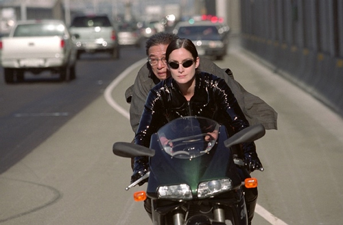 縱觀世界科幻電影史,“崔妮蒂駕駛摩托車”這一意象可謂影響深遠。許多影視作品,都會借助這種方式來塑造獨立、堅韌、帥氣的女性形象。譬如,在諾蘭導演的《蝙蝠俠:黑暗騎士崛起》(2012)中,安妮?海瑟薇飾演的貓女,一身緊身黑衣加摩托車的形象,幾乎是崔妮蒂的再現。由蓋爾?加朵飾演的吉澤爾,在《速度與激情4》中初登場時,也是騎著摩托車帥氣登場,成為一群駕駛汽車的男性角色中的特殊存在。甚至跨界到日本動畫電影界,例如《名偵探柯南》系列中,黑衣組織里的貝爾摩德、雪莉等女性成員,駕駛哈雷摩托車的鏡頭也多次出現?!芭浴薄昂谝隆薄澳ν熊嚒钡?,都帶有《黑客帝國》中崔妮蒂的影子?!按弈莸佟边@一人物最終突破了科幻電影的局限,成為一個永恒的經典銀幕形象。