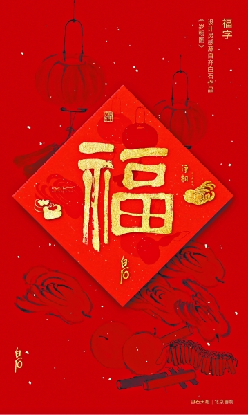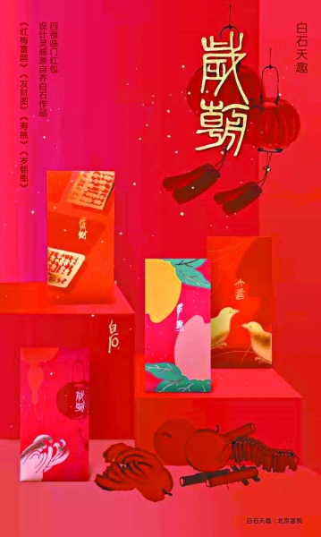 春節文化年貨與延續了數千年的節日一樣,離不開傳承,歷代名人書畫也是絕佳素材。北京畫院就以齊白石先生的多幅作品為靈感,設計了幾款紅包:大喜紅包,取材齊白石一幅梅花圖上的喜鵲,紅包的名字也來自這幅畫的題款:大喜;發財紅包上的一只小算盤,源自齊白石的《發財圖》;歲朝紅包的靈感則源自齊白石的《歲朝圖》。每款紅包上都印有齊白石原作簡介,便于人們了解相關文化信息,而直接取材于齊白石書法的福字,更是在上個月拿到廣州藝博院售賣時遭遇賣斷貨。