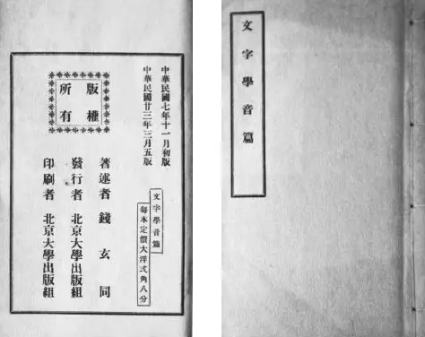 《文字學音篇》初版于1918年,由北京大學出版組出版,到1937年已出至第6版。1988年山西人民出版社出版的《錢玄同音學著作選輯》和1999 年中國人民大學出版的《錢玄同文集》第5卷都收錄了這部著作。在臺灣,1964年學生書局也重印過該書。