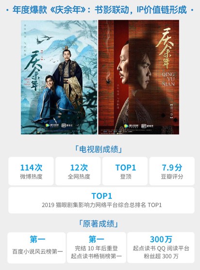 報告認為,網文IP在持續運營下成為文化產業的新增長極,IP的價值鏈條不斷深化。以《慶余年》為例,其獲得了豆瓣評分7.9分,在騰訊視頻播放量沖破67億次,愛藝奇熱度最高值8800,是2019年貓眼劇集影響力網絡平臺綜合總排名第一位。劇集播放期間,原著在起點讀書APP上的在線閱讀人數、單書在線閱讀收入增長50倍、推薦票達352萬張,聚集超200萬粉絲??缙脚_的不同場景用戶因“故事”而互動討論,推動《慶余年》在完結十年后重登暢銷榜前三甲。