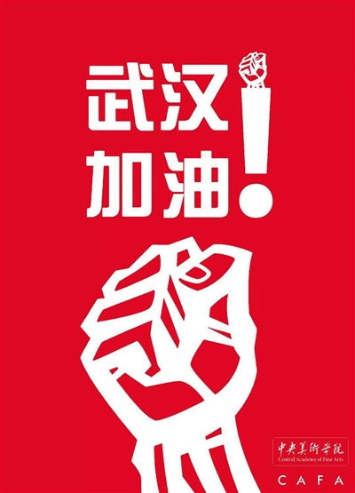來自中央美術學院的張召林創作的海報《武漢加油!》紅底白字、構圖簡潔,沖擊力十足。海報的主體為一個緊握的拳頭,線條粗壯,結實有力。作者表示,希望用拳頭的力量感來表達戰勝疫情、戰勝困難的決心與信心。