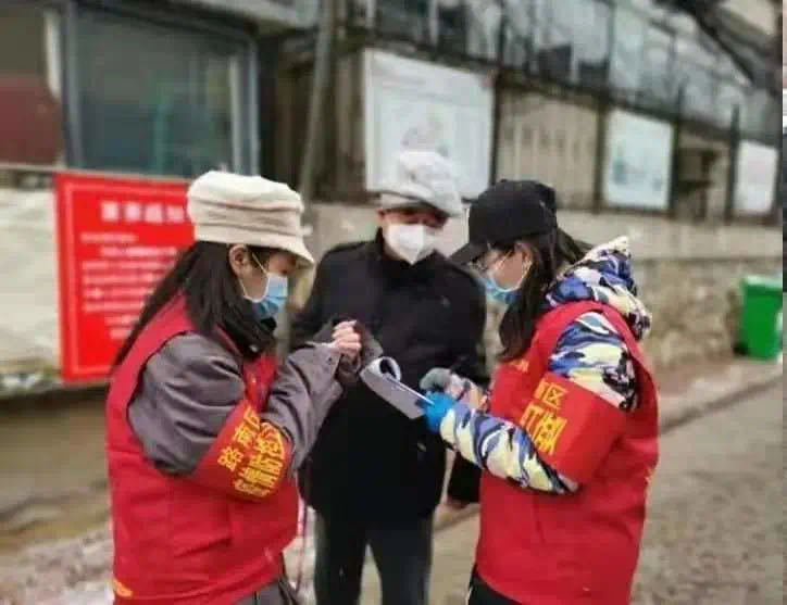 琪琪(右)與同事對出入小區人員進行登記