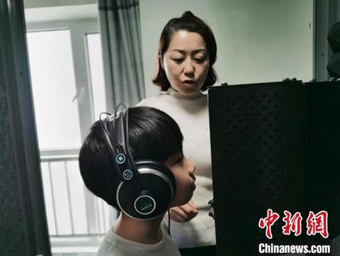河北省邢臺市育才小學的王小蹦和媽媽一起錄制“抗疫新兒歌”《病毒走開》。中國兒童中心供圖