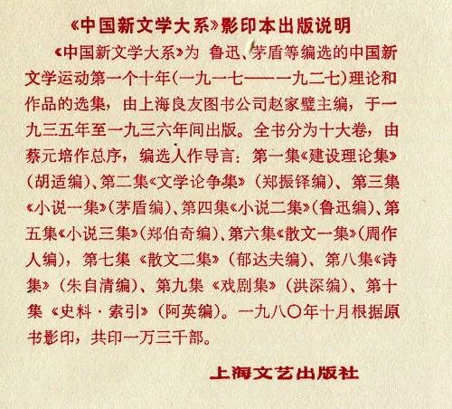 傅東華先生說:“將新文學十年的成績總匯在一起,不但給讀者以極大便利,并使未經結集的作品不至散失,我認為文學大系的編輯是對于新文學發展,大有功勞的?!?/span>