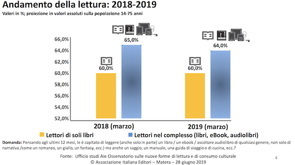 意大利的出版商會出書,也會賣書,這一點從它們積極參與建設網上書店便可以看出。同時,它們也重視讀者。意大利出版商協會的報告以PISA項目開篇,來引出他們對讀者情況的調查。以下是出版商協會給出的2018年與2019年14到75歲意大利人的閱讀情況: