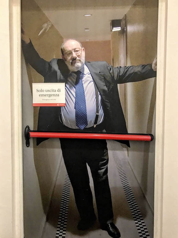 佩魯賈的la Feltrinelli書店中一景:緊急出口上貼著翁貝托·??频木尴?,并寫著:“只有緊急情況才能離開”,似乎暗指:若無急事(哪怕疫情來臨?),請勿離開閱讀的世界。? 周之桓