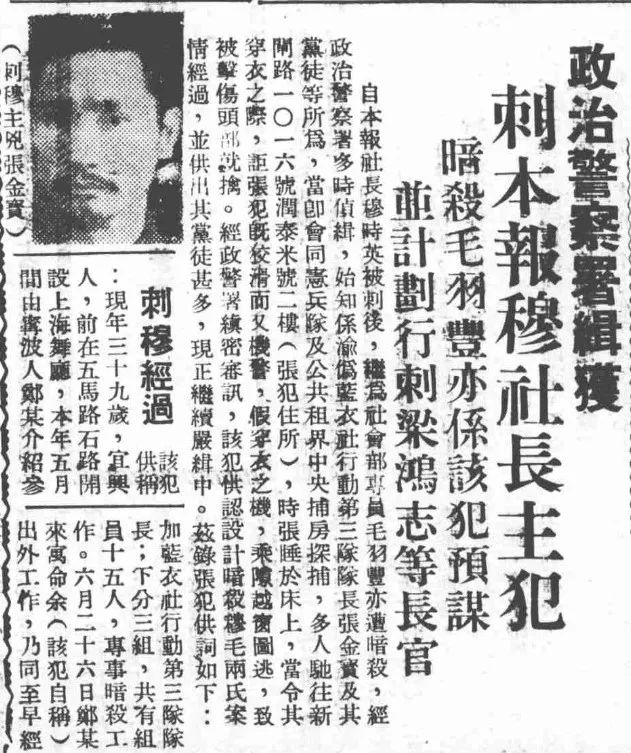自本報社長穆時英被刺后,繼為社會部專員毛羽豐亦遭暗殺,經政治警察署多時偵緝,始知系渝偽藍衣社行動第三隊隊長張金寶及其黨徒等所為,當即會同憲兵隊及公共租界中央捕房探捕,多人馳往新閘路一〇一六號潤泰米號二樓(張犯住所),時張睡于床上,當令其穿衣之際,詎張犯既狡猾而又機警,假穿衣之際,乘隙越窗圖逃,致被擊傷頭部被擒。經政署縝密審訊,該犯供認設計暗殺穆毛兩氏案情經過,并供出其黨徒甚多,現正繼續嚴緝中。茲錄張犯供詞如下:
