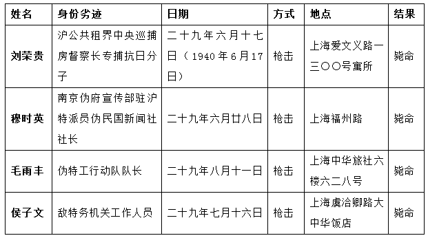 此外,《忠義救國軍志》也記載了抗戰爆發前后,軍統“總指揮部”、各區(站)、各“行動隊”等各個單位鋤奸行動的具體信息——包括漢奸姓名、身份劣跡,行動的單位、日期、手段、地點和結果等。其中有張金寶所在的軍統“上海直屬行動隊”狙殺劉榮貴、穆時英、毛雨豐、侯子文等記載,相關情況見下表。