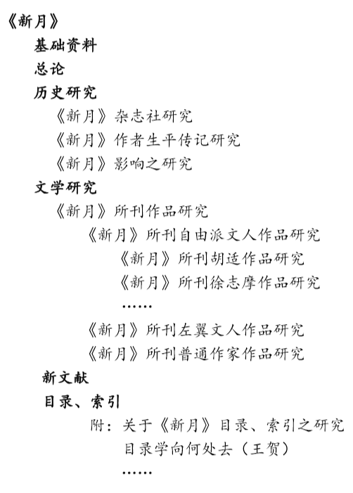 不過,為了討論的方便,這里仍不妨舉一個與《新月》雜志有關的資料(包含專書、報刊文獻等等)編目的例子。但首先必須聲明的是,這個目錄只是我自己一時所擬,只是一方便法門,實際情形一定要較此復雜得多,當然也需要被不斷地進行完善、修改: