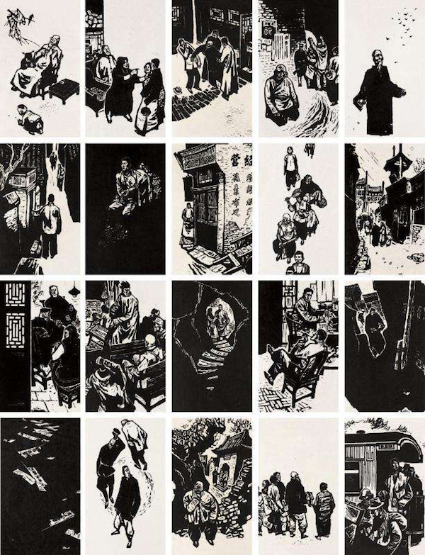 高榮生的《四世同堂》是根據中國現代長篇小說的經典名著老舍的《四世同堂》創作而成。小說以祁家四世同堂的生活為主線,描繪了盧溝橋事變抗日戰爭爆發后,淪陷下的北平,小羊圈胡同里各個階層人們的榮辱浮沉,生死存亡。老舍以其爐火純青的小說技藝刻劃了祁老人、瑞宣等一系列栩栩如生的藝術形象,展現了風味濃郁的北平生活畫卷,至今傳讀不衰,歷久彌新。版畫家高榮生的這套《四世同堂》插圖,創作于1982-1984年間,是這部名著的眾多插圖中最為著名的一套。它與小說的情節發展結合緊密,在深沉的史詩氣質之外,突出了老舍作品特有的那種幽默與戲謔。