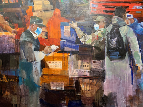 細看這件巨大的作品,其中所繪的都是我們周遭最普通的人,他們中有醫護工作者、修建雷神山火神山的建筑工人、堅守崗位的快遞小哥和社區志愿者,再細看,其中有著一些熟悉的感人情節,比如“穿上梅西球衣的小男孩”“奔赴抗議一線前的理發”“每天為醫護人員送餐的志愿者”,還包括援助物質上“山川異域 風月同天”的話語……這一切畫家用富有感情的筆觸描繪了這組抗擊疫情戰士群像。在特殊的環境下,畫中人也成為每個人心中的英雄和最可愛的人,也正是因為他們堅守創造出了不凡。參與創作的畫家也感言“這場從未遭遇的經歷讓我們更具凝聚力和共情力,平凡的生活是那么寶貴?!?/p>
