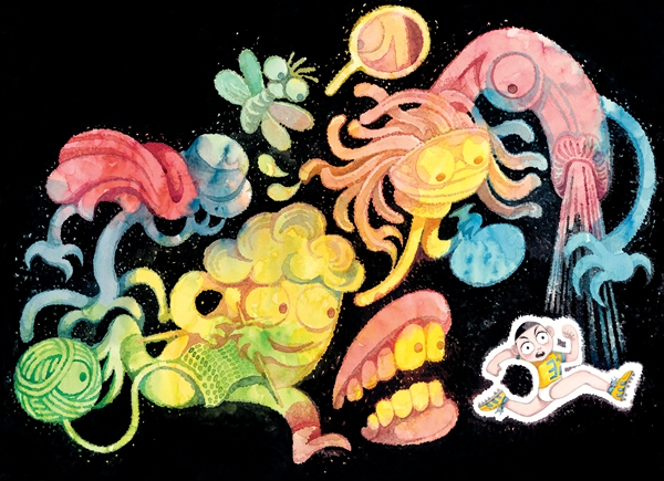 澎湃新聞:這本書里您畫了大量“睡魔怪”的形象,每次出現幾乎都不重復,我覺得比較有意思的是,除了蟲子、雷電這種孩子在生活中比較容易害怕的東西,還有大量像牙膏、花灑、哨子、馬桶、鬧鐘這些看似無害的日用品,有一幅畫面里還出現了奶奶笑呵呵織著毛線的形象。為什么會這樣設計呢?您有參考過類似兒童心理學之類的專業材料還是更多地從個人經驗或是孩子的講述中取材?