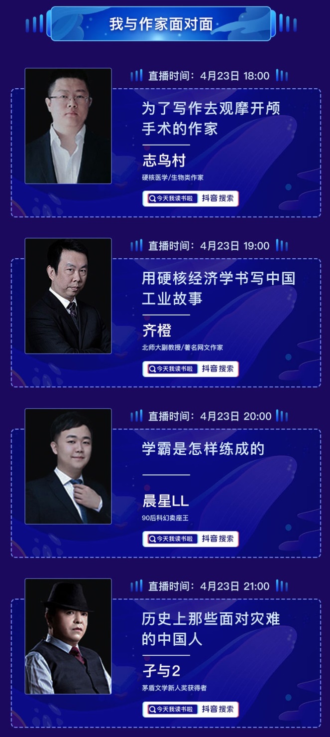來自閱文的多位作家做客抖音直播間,分享他們的寫作故事與讀書體會。同時,雙方還在QQ閱讀平臺推出多個閱讀專區、開放大批抗疫主題優秀作品資源。23日當晚,“今天我讀書啦”活動將在抖音平臺開啟,閱文旗下“齊橙”、“志鳥村”、“晨星LL”和“孑與2”四位作家將亮相直播間。