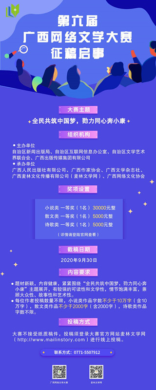 第六屆廣西網絡文學大賽自4月啟動,投稿截止時間為2020年9月30日,以官方網站麥林文學網線上投稿為主。歡迎廣大作家、文學愛好者參與廣西網絡文學大賽。
