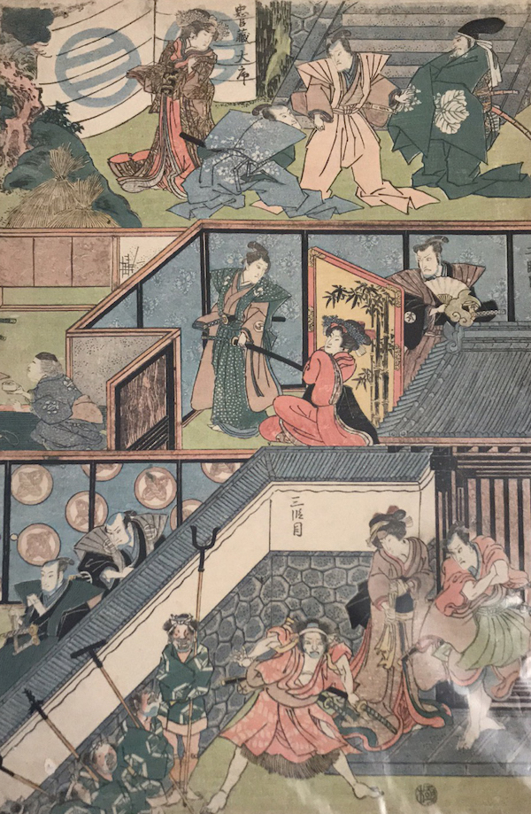 此幅作品取材江戶時代武士為主公復仇的故事。圖中人物衣著鮮明,眼神互動。場景轉換自然。角色開面明朗。
