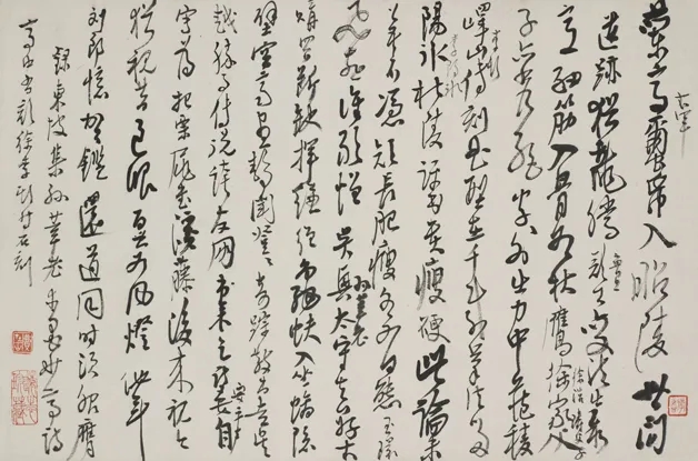 靜靜凝視高二適的書法遺墨,那靈異的墨線,似高猿悲叫,亂水潛奔,這是流淌在古典詩文和經典碑帖中的心靈對晤,是意與古會的神異契合。在筆力彌滿、意態天矯,行氣淋漓的筆勢中透映出一位傳統文人的自我風神。從“赴速急就稱奇觚,鬼哭神驚運思初”的詩句里,流露出他作書時“筆所未到氣已吐”的豪邁心象。高二適的書法意象以氣勢開張、書蘊“詩意”為基調,以其精湛的筆墨古法、深厚淵深的文史修養和特立高潔的文人風骨幻化熔鑄,開古典主義之新境,堪稱傳統書法草書一脈的浪漫主義大師。